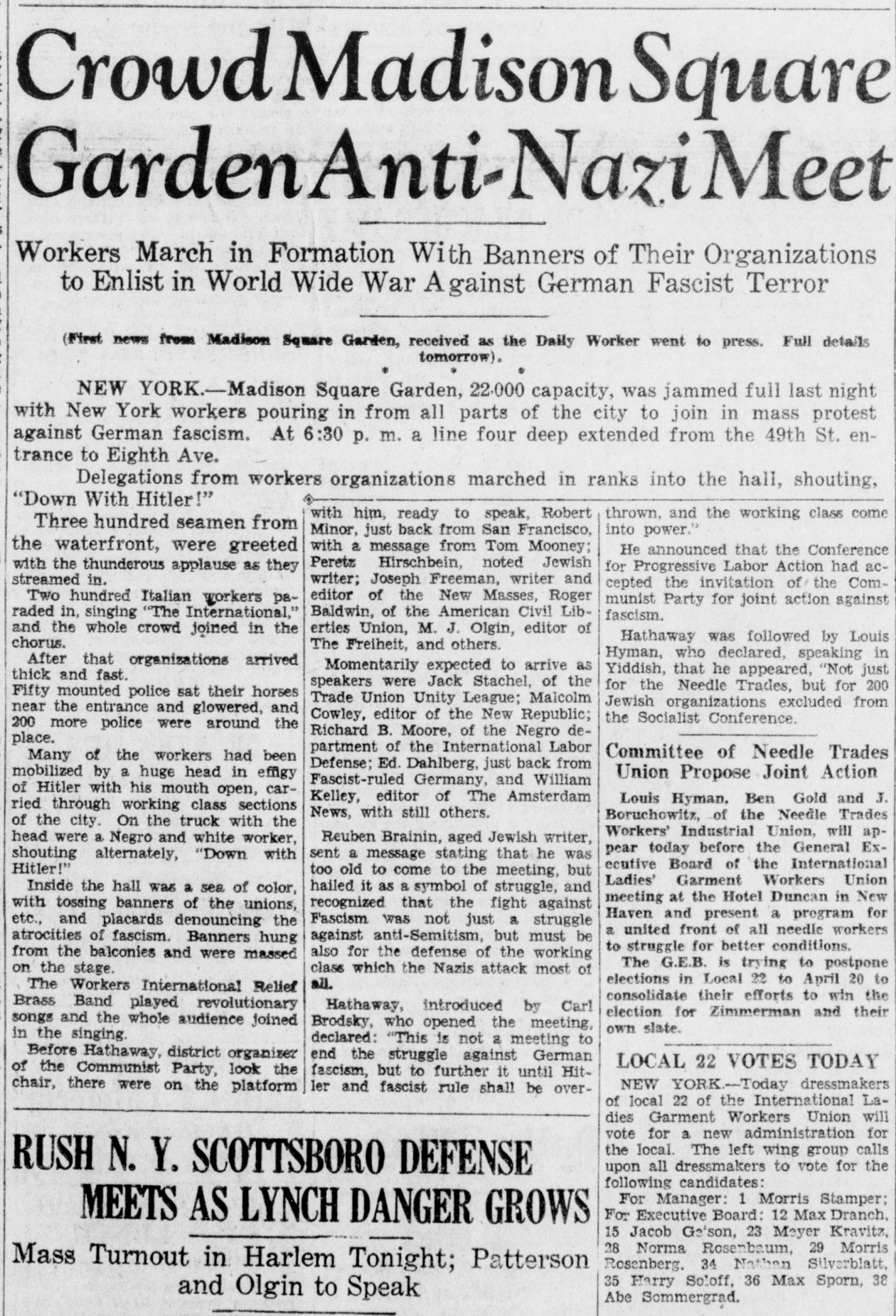 Madison Square Garden, 22,000 capacity, was jammed full last night with New York workers pouring in from all parts of the city to join in mass protest against German fascism. At 6:30 p. m. a line four deep extended from the the 49th St. entrance to Eighth Ave. ...